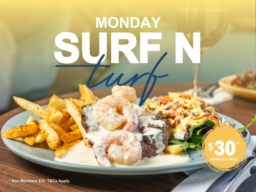 Every Monday enjoy a 200g rump steak topped with creamy garlic prawns, served with chips & salad. $30 members